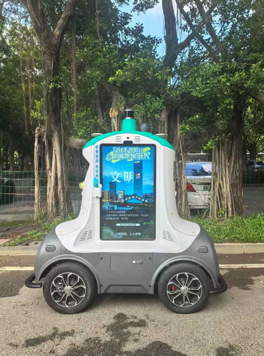 當日下午,考察團一行率先前往深圳大學、蓮花山公園及市民中心,現(xiàn)場調研白澤智AI服務機器人的實際運行情況。在深圳大學,機器人精準完成校園導覽、課程咨詢等服務,人機交互流暢自然;蓮花山公園內,機器人化身“便民助手”,為游客提供路線指引、景點介紹以及便民服務,全方位展現(xiàn)了在戶外復雜環(huán)境中的穩(wěn)定性能與實用價值;市民中心政務服務場景里,機器人高效輔助信息查詢、業(yè)務指引,進一步驗證了其在政務、教育、文旅等多領域的適配能力??疾靾F通過近距離觀察設備操作流程、服務響應速度及場景適配細節(jié),對其技術成熟度與實用價值給予高度認可。